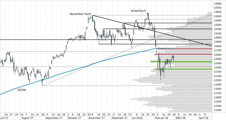 Aus dem Kräftesammeln wurde gestern ein zögerliches Abwarten, und nachdem das Bundesverwaltungsgericht den Weg für Fahrverbote in deutschen Städten freimachte, gerieten die Blue Chips zunehmend in die Defensive. Im Sog einer uneinheitlichen Wall Street - dort fand die erste Rede des Fed-Chefs Powell vor dem Repräsentantenhaus in Washington große Beachtung - gab der DAX per Tagesschluss letztlich 0,3% ab und rutschte wieder unter 12.500 Punkte zurück. Schade, denn damit könnte nun eine Strafrunde fällig werden...