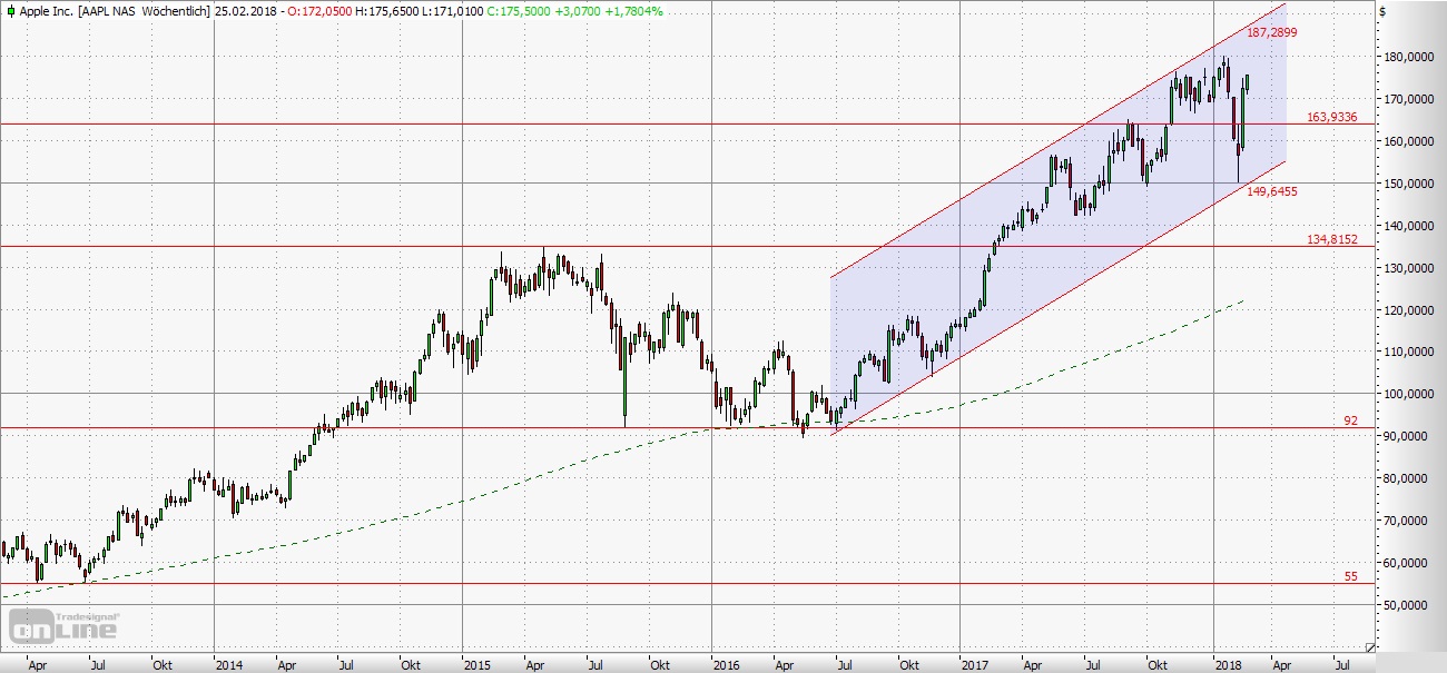 Apple befindet sich seit Anfang 2009 in einem langfristigen Aufwärtstrend, dessen untere Begrenzung zurzeit im Bereich von 105,00