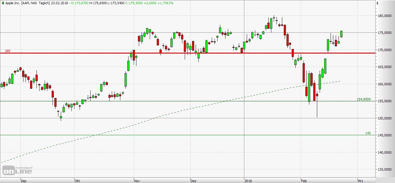 Mai 2017 ein Zwischenhoch bei 156,65 USD. Von diesem Kursniveau fiel Apple im Juni 2017 bis in den Bereich von 142,00 USD zurück