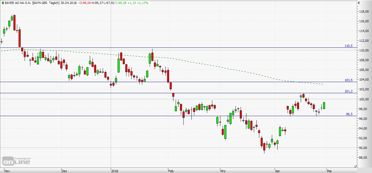 gebrochen. Mit einem kräftigen Aufwärtsimpuls durchbrach Bayer am 27. April 2017 den Widerstand bei 109,00 Euro und erreichte