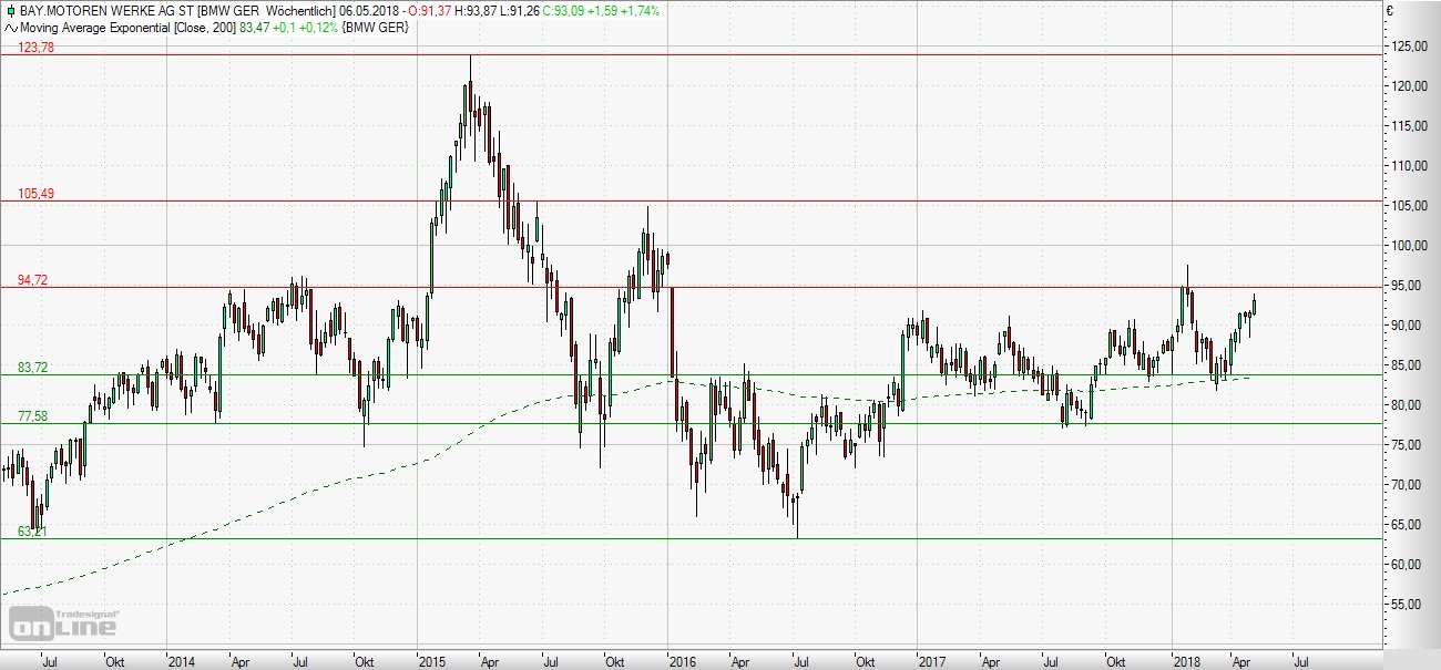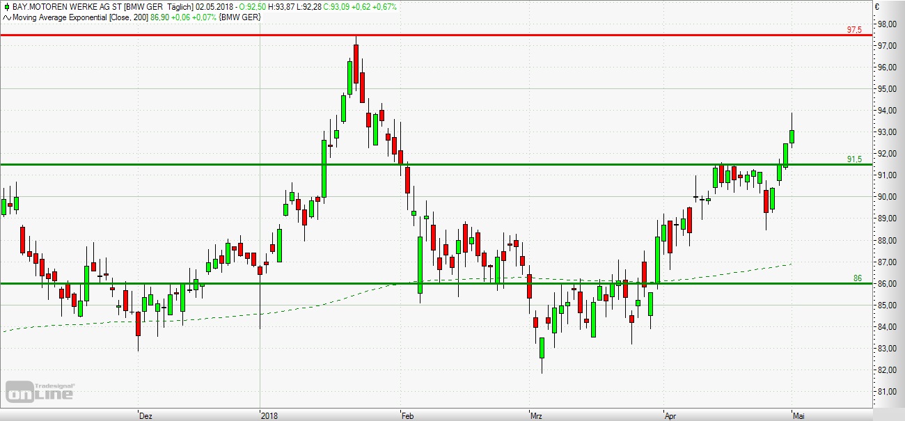 Startet BMW leicht im Plus, käme aus Sicht der Charttechnik ein Kauf bei einem Rücksetzer auf den gestrigen Schlusskurs bei 93,09