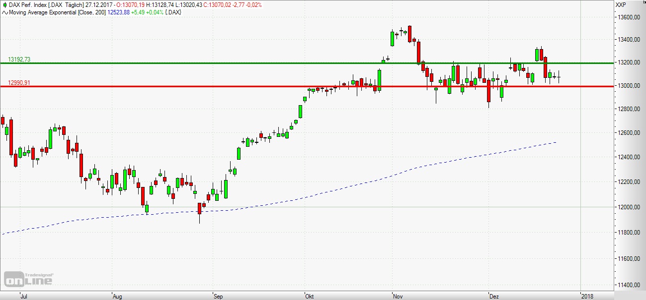 Der DAX gab gestern um 0,02 Prozent nach und beendete den Handel bei 13.070 Punkten. Damit ist der deutsche Leitindex weiterhin in einer relativ engen Schiebezone zwischen 13.000 Punkten und 13.200 Punkten eingeklemmt. Die Long-Szenarien: Eröffnet der DAX leicht im Plus, bietet sich aus charttechnischer Sicht ein Kauf bei einem Rücksetzer auf den gestrigen Schlusskurs bei 13.070 Punkten, leicht oberhalb der 13.200-Punkte-Marke oder aber in der ersten Korrektur einer Aufwärtsbewegung an, und zwar rund 40 Prozent unterhalb des letzten Hochs. Wird hingegen im Minus begonnen, könnten Trader durch die eben geschilderte Korrekturvariante, bei einem Abprall von der Unterstützung bei 12.900 Punkten oder aber nach dem Bruch der Schlusskursmarke einsteigen. Aus Sicht der Charttechnik spricht nichts gegen eine Gewinnmitnahme circa 250 Punkte oberhalb des jeweiligen Tagestiefs. Die Short-Szenarien: Startet der Index leicht im Minus, ist eine Positionierung entweder bei einem Test der Schlusskurslinie, leicht unterhalb der Unterstützung bei 12.900 Punkten oder aber nach der ersten Korrektur einer Abwärtsbewegung möglich, und zwar nach dem Bruch des letzten Tiefs. Wird allerdings im Plus eröffnet, wäre eine Platzierung durch die gerade beschriebene Korrekturvariante, leicht unterhalb des 13.200-Punkte-Widerstands oder nach dem Bruch des Schlusskursniveaus denkbar. Der Zielbereich aus Sicht der Charttechnik läge circa 250 Punkte unterhalb des jeweiligen Tageshochs. Zur Absicherung aller Trades käme ein Stopp in Höhe von mindestens 60 Punkten in Frage, bei Short-Trades ober- und bei Long-Trades unterhalb des Einstiegs. |