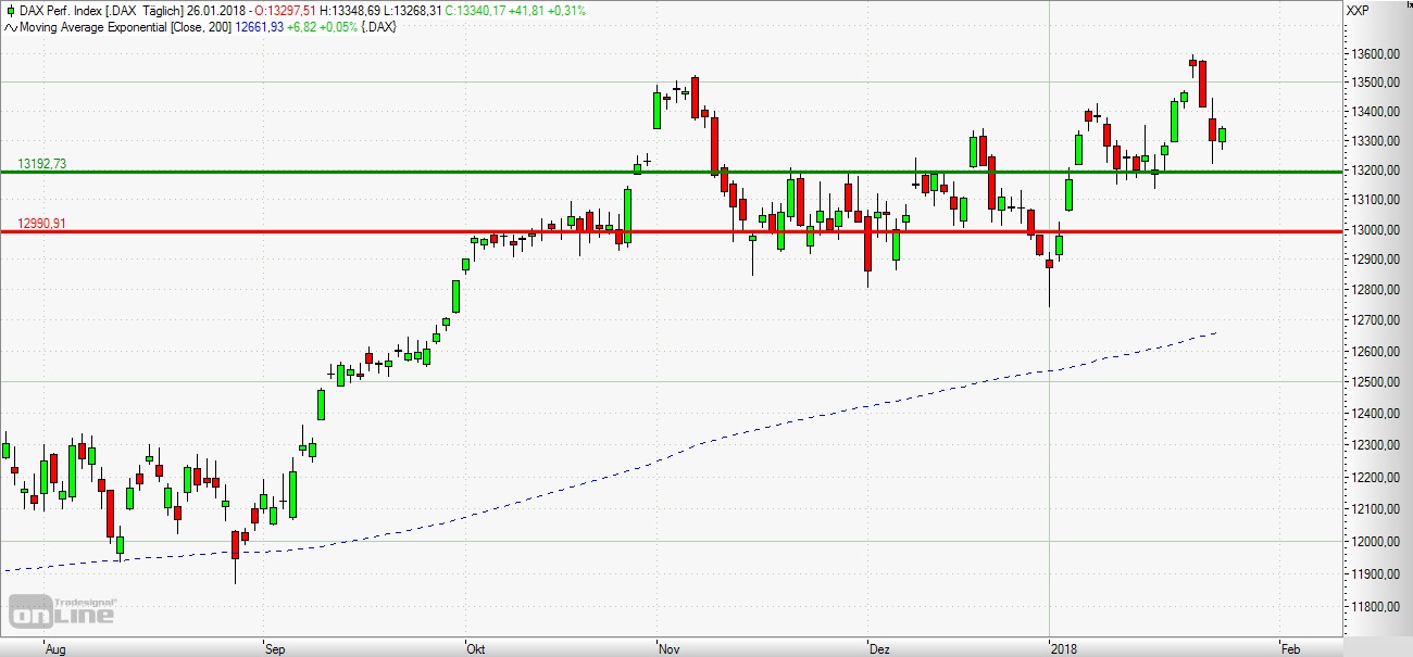Abprall von der Unterstützung bei 13.200 Punkten oder aber nach dem Bruch der Schlusskursmarke einsteigen. Aus Sicht