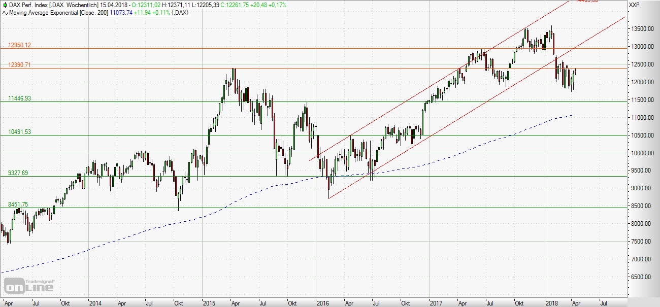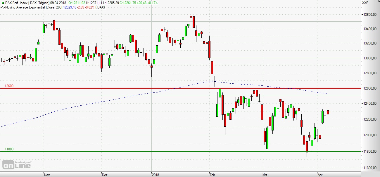 Leitindex dabei knapp oberhalb der charttechnisch relevanten Unterstützung bei 12.200 Punkten das Tagestief. Die Long-Szenarien: