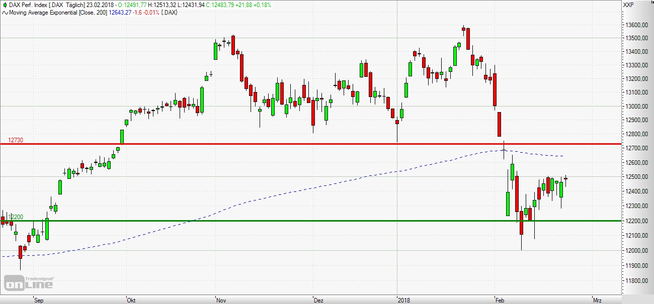 Leitindex den siebten Tag in Folge unmittelbar unterhalb des 12.500-Punkte-Widerstands. Die Long-Szenarien: Eröffnet der DAX