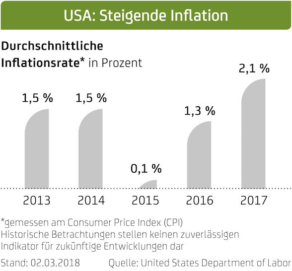 Zunehmende Sorgen über einen steigenden Inflationsdruck waren schon für die jüngsten Kursturbulenzen an den Aktienmärkten verantwortlich. Denn ein starker Preisanstieg könnte die Notenbanken schneller als erwartet zu einer Straffung der Geldpolitik veranlassen. Für die Eurozone rechnet UniCredit Research aktuell jedoch mit keiner starken Beschleunigung der Teuerung. Demnach wird sich die Inflationsrate (Kernrate ohne Nahrungsmittel und Energie) in diesem Jahr in einer Spanne zwischen 1,3 und 1,5 Prozent bewegen. Mit einer Zinsanhebung durch die EZB rechnen die Experten frühestens im vierten Quartal 2019. Problematischer ist die Situation in den USA. Hier wird nach aktueller Prognose ein Anstieg der Inflationsrate bis zur Jahresmitte auf 2,8 Prozent erwartet, worauf die US-Notenbank Fed bis Ende 2018 mit drei Zinsanhebungen um jeweils 25 Basispunkte reagieren könnte.