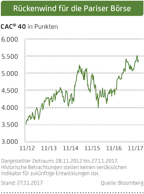 Auch an der Pariser Börse sorgte der Einzug von Emmanuel Macron in den Élysée-Palast für frischen Schwung. So knackte der französische Aktienleitindex CAC® 40 nach den Präsidentschaftswahlen zunächst die 5.000-Punkte-Marke. Von dort aus kletterte das Börsenbarometer zuletzt bis auf 5.400 Zähler hoch. Solche Indexstände sah man zuletzt vor mehr als zehn Jahren (siehe Chart rechts). Was die weitere Kursentwicklung französischer Aktien betrifft, zeigen sich die Analysten tendenziell optimistisch. Die Stoßrichtung der Macron‘schen Reformen sei überwiegend wirtschaftsfreundlich. Außerdem hätte er unbestreitbar einen größeren Ehrgeiz als viele seiner Vorgänger, zitiert die Frankfurter Allgemeine Zeitung einen Pariser Aktienexperten (Quelle: www.faz.net vom 24. Oktober 2017).