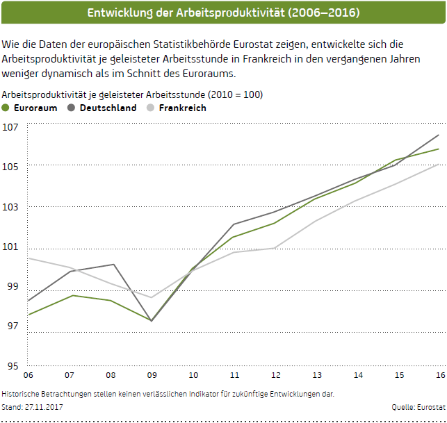 Wichtige ökonomische Daten zeigen den Nachholbedarf Frankreichs auf. Beispiel: Arbeitsproduktivität. In keinem Land der Europäischen Union wird im Jahresschnitt weniger gearbeitet als in Frankreich. Auf 1.646 Stunden belief sich zuletzt die jährliche Arbeitszeit eines vollzeitbeschäftigten Franzosen, das sind 199 Stunden weniger, als ein durchschnittlicher Vollzeitbeschäftigter in Deutschland arbeitet (Quelle: Studie von Coe-Rexecode vom 22. Juni 2016). Zwar ist die Arbeitsproduktivität je geleisteter Arbeitsstunde in den letzten Jahren gestiegen, aber mit weitaus geringerer Dynamik als im übrigen Euroraum (siehe Grafik). Frankreich lebt über seine Verhältnisse Nicht förderlich für die Wettbewerbsfähigkeit ist auch die hohe Staatsquote. Auf 56,2 Prozent belief sich der Anteil der französischen Staatsausgaben am Bruttoinlandsprodukt (BIP) im Jahr 2016. Kein anderes EU-Land weist eine höhere Quote aus (Quelle: Statista). Weitere Schwachstellen sind die ausufernden Staatsfinanzen sowie die relativ hohe Erwerbslosenrate, wobei insbesondere die Jugendarbeitslosigkeit erschreckende Ausmaße angenommen hat. Schließlich leidet unser Nachbarland auch nach wie vor unter seiner notorischen Exportschwäche. Allein im vergangenen Jahr belief sich das Handelsbilanzdefizit auf 44 Milliarden Euro (Quelle: Eurostat). Alle diese Daten zeigen: Frankreich schwächelt. Und genau daran will Macron mit seinen Reformen etwas ändern.