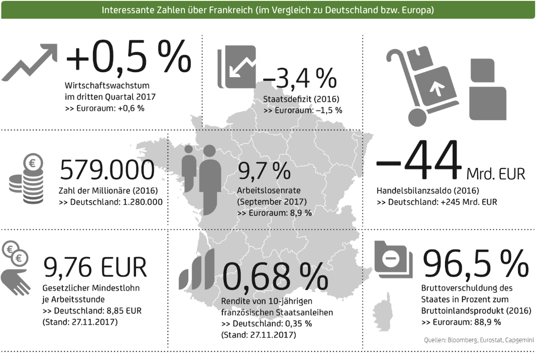 Es ist eine der außergewöhnlichsten politischen Karrieren in der jüngeren europäischen Geschichte: der rasante Aufstieg von Emmanuel Macron vom politischen Nobody zum französischen Staatspräsidenten. Auch in Deutschland sorgte der fulminante Wahlsieg des ehemaligen Investmentbankers für großes Aufsehen. Immerhin ist der gerade erst mal 39 Jahre alte Macron mit nicht weniger als dem Versprechen angetreten, die Grande Nation zu ihrer alten Stärke zurückzuführen. Und das geht seiner Überzeugung nach nur durch umfassende, wenngleich schmerzliche Reformen. Tatsächlich hat die internationale Wettbewerbsfähigkeit der sechstgrößten Volkswirtschaft der Welt in der jüngeren Vergangenheit signifikant gelitten. Als „Europas Großbaustelle“ wurde Frankreich schon in der deutschen Wirtschaftspresse bezeichnet (Quelle: www.welt.de vom 17. März 2017). Das mag übertrieben sein, Handlungsbedarf besteht aber sehr wohl.