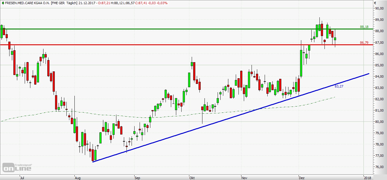 Bis April 2015 war Fresenius Medical Care eine der am stärksten im DAX gestiegenen Aktien. Seit dem Tief im März 2009 bei 25,40 Euro verdreifachte sich der Wert. Nach dem Beginn einer Korrektur ab Mitte 2015 verlor die Aktie im August 2015 innerhalb von fünf Wochen über 20 Prozent, bevor Anleger die Berührung des mittelfristigen Aufwärtstrends zum Einstieg nutzten. Erneut wurde das bisherige Allzeithoch bei 82,32 Euro angesteuert. Der Höhenflug stoppte Anfang November 2015 knapp darüber bei 83,17 Euro. Aufgrund von fehlenden Folgekäufen drehte Fresenius Medical Care wieder nach unten ab und korrigierte bis in den Bereich von 74 Euro. Nach einer kurzen volatilen Gegenbewegung scheiterte die Aktie kurz am Widerstand bei 83,17 Euro, um dann auf ein neues historisches Hoch bei 85,65 Euro zu steigen. Die nachfolgende Korrektur führte bis zur Unterstützung bei 70,69 Euro. Im Großen und Ganzen bewegt sich die Aktie seit April 2015 hochvolatil zwischen 70,00 und 83,00 Euro. Ein Tiefpunkt bei 77,22 Euro wurde Ende August zum Einstieg genutzt. Anfang Dezember erreichte die Aktie das bisherige Jahreshoch. Seitdem kommt es immer wieder zu Verkäufen zwischen 88,00 und 89,00 Euro. Weitere Verluste liegen im Bereich des Möglichen. Die Long-Szenarien: Eröffnet Fresenius Medical Care leicht im Plus, käme aus Sicht der Charttechnik ein Kauf bei einem Rücksetzer auf den Vortagesschlusskurs bei 87,41 Euro, leicht oberhalb des Widerstands bei 88,19 Euro oder aber in der ersten Korrektur einer Aufwärtsbewegung in Frage, und zwar circa 40 Prozent unterhalb des letzten Hochs. Wird hingegen im Minus eröffnet, sollte nach Regeln der technischen Analyse eine Platzierung entweder bei einem Abprall an der Unterstützung bei 86,79 Euro, durch die eben besprochene Korrekturvariante oder aber nach dem Bruch des Schlusskursniveaus ein guter Einstiegspunkt sein. Eine Gewinnmitnahme könnte rund 1,80 Euro oberhalb des jeweiligen Tagestiefs geplant werden. Die Short-Szenarien: Beginnt die Aktie leicht im Minus, indiziert die Charttechnik eine Positionierung bei einem Test der Schlusskursmarke, bei einem Bruch der Unterstützung bei 86,79 Euro oder aber nach der ersten Korrektur einer Abwärtsbewegung, und zwar nach dem Bruch des letzten Tiefs. Wird aber im Plus begonnen, könnten Trader durch die gerade geschilderte Korrekturvariante, bei einem Abprall vom Widerstand bei 88,18 Euro oder nach dem Bruch der Schlusskurslinie einsteigen. Der Zielbereich aus Sicht der Charttechnik läge circa 2,20 Euro unterhalb des jeweiligen Tageshochs. Sinnvoll wäre eine Absicherung aller Trades durch einen Stopp in Höhe von circa 0,50 Euro, bei Long-Trades unter- und bei Short-Trades oberhalb des Einstiegs. |
