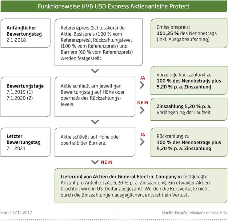 Mitte November stellte Flannery seine Umbaupläne vor. So richtet GE künftig den Fokus auf drei Kernbereiche: Luftfahrt, Energie und Gesundheit. Dort sieht der Konzern die größten Wachstumsmöglichkeiten. Derweil sollen in den kommenden Jahren Unternehmensteile im Gesamtwert von über 20 Milliarden US- Dollar abgestoßen werden. Auf der Verkaufsliste stehen unter anderem die Lichtsparte und der Transportbereich. Oberste Priorität haben derweil Kostensenkungen. Flannerys Ziel ist es, rund zwei Milliarden US-Dollar pro Jahr einzusparen. Zur Finanzierung der Restrukturierung wurde nun die Dividende zum zweiten Mal seit den 1930er-Jahren gekürzt. Euphorie konnte der neue Unternehmenschef bei den Anlegern noch nicht auslösen. Nach Angaben von Thomson Reuters stuft ein Großteil der Analysten die Aktie mittelfristig aber immerhin als haltens- oder gar kaufenswert ein (Quelle: Reuters, 27. November 2017). Für vorsichtige Anleger könnte sich vor diesem Hintergrund eine HVB USD Express Aktienanleihe Protect als interessante Anlage erweisen.
