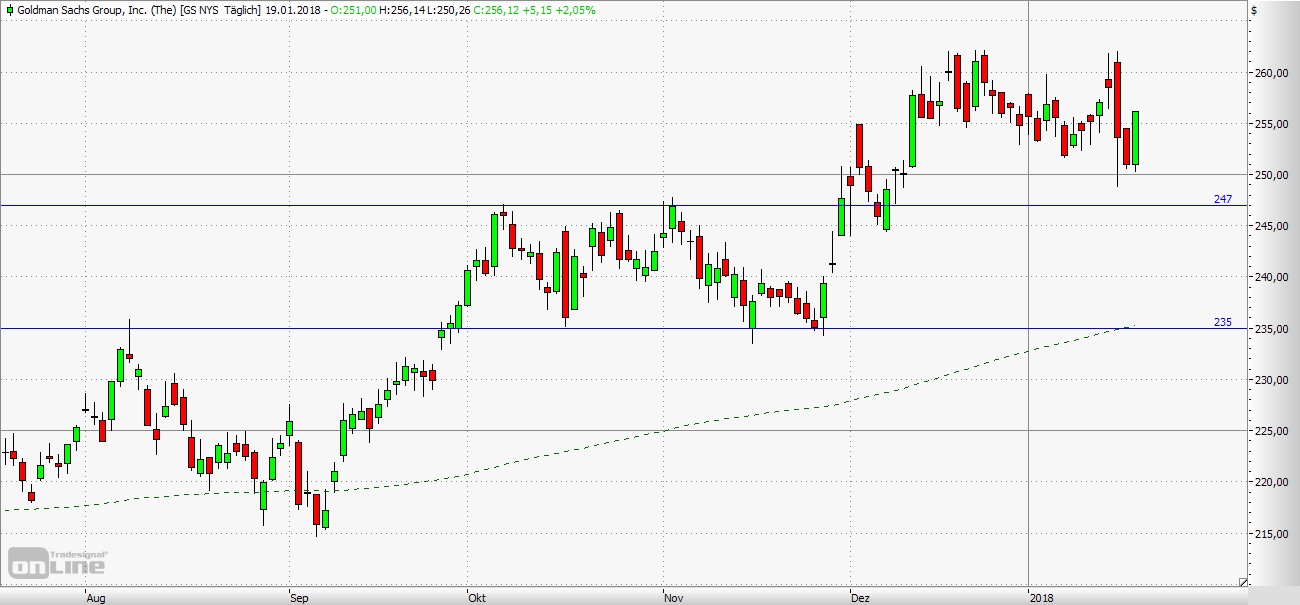 In 2016 durchlief Goldman Sachs eine klassische Bodenbildungsformation in Form eines doppelten Tiefs im Bereich zwischen 140,00 USD und 175,00 USD. Nach dem Wahlsieg Donald Trumps setzte die Aktie Anfang November 2016 zu einem Höhenflug an, der den Kurs von Goldman Sachs im März 2017 auf ein neues Allzeithoch bei 255,15 USD katapultierte. Danach schwenkte das Wertpapier in den Korrekturmodus über. Dabei wurde Ende Mai ein zyklisches Tief bei 209,62 USD markiert. Danach arbeitete sich die Aktie bis Mitte September bis an den 230,00-USD-Widerstand heran, der nach einer kurzen Konsolidierung mit einer Notierungslücke nach oben durchbrochen werden konnte. Es folgte eine Seitwärtsbewegung zwischen 235,00 USD und 247,00 USD. Ende November 2017 startete die Aktie eine Rallye, die kurz nach Weihnachten zu einem neuen Allzeithoch bei 262,14 USD führte. Nach einem kleinen Rücksetzer bis in den Bereich von 250,00 USD hat sich die Aktie mit dem Freitagsschlusskurs von 256,12 USD wieder in den Bereich des Allzeithochs hochgearbeitet. Damit könnte die Aktie in den kommenden Tagen einen neuen historischen Rekordwert erreichen. Kommen wir nun zu den Einstiegsszenarien für kurzfristig interessierte Trader. Die Long-Szenarien: Startet Goldman Sachs leicht im Plus, wäre aus Sicht der Charttechnik ein Kauf bei einem Rücklauf auf den Freitagsschlusskurs bei 256,12 USD, leicht oberhalb der 260,00-USDLinie oder aber in der ersten Korrektur einer Aufwärtsbewegung denkbar, und zwar rund 40 Prozent unterhalb des letzten Hochs. Wird jedoch im Minus eröffnet, könnten Trader nach den Regeln der technischen Analyse bei einem Abprall von der Unterstützung bei 252,00 USD, durch die eben besprochene Korrekturvariante oder nach dem Bruch des Schlusskursniveaus einsteigen. Eine Gewinnmitnahme empfiehlt sich circa 4,80 USD oberhalb des jeweiligen Tagestiefs. Die Short-Szenarien: Beginnt die Aktie leicht im Minus, indiziert die Charttechnik eine Platzierung bei einem Test der Schlusskurslinie, leicht unterhalb des 252,00-USD-Niveaus oder aber nach der ersten Korrektur einer Abwärtsbewegung, und zwar nach dem Bruch des letzten Tiefs. Wird aber im Plus gestartet, könnten sich Trader durch die gerade beschriebene Korrekturvariante, bei einem Abprall vom 260,00-USD-Widerstand oder leicht unterhalb der Schlusskursmarke platzieren. Das Kursziel läge rund 4,80 USD unterhalb des jeweiligen Tageshochs. Sinnvoll wäre eine Absicherung aller Trades durch einen Stopp in Höhe von circa 0,70 USD, bei Long-Trades unter- und bei Short-Trades oberhalb des Einstiegs.