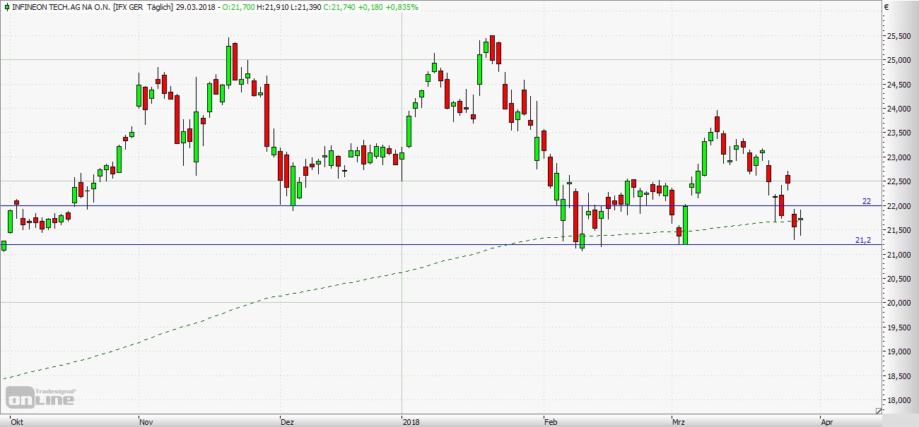 Nach einem kurzzeitigen Rücksetzer bis in den Bereich von 22,00 Euro testete Infineon Ende Januar nochmals das Hoch aus 2017.