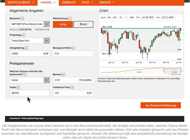 Im nächsten Schritt geht es um die Erstellung des passenden Produkts über my.one direct. Sie benötigen dafür lediglich ein Konto/Depot bei unserem Kooperationspartner, dem Online-Broker flatex, sowie die Termingeschäftsfähigkeit. Sie loggen sich also bei flatex ein und klicken dann im Menüpunkt „Handel“ auf „my.one direct“. Es öffnet sich die Eingabemaske. Dort können Sie Ihr Wunschprodukt konfigurieren, etwa durch Angabe des Basiswertes (z. B. Allianz), der Marktrichtung (z. B. Long), des bevorzugten Produkttyps (z. B. Turbo), des Anlagebetrags, des gewünschten Hebels oder einer Barriere (siehe Abbildung unten). Das geht alles ganz schnell, zumal Sie ja bereits über den onemarkets Trading-Desk die Konditionen Ihres Trades spezifiziert haben. Sind alle Eingaben gemacht, werden Ihnen die Daten noch einmal gesammelt angezeigt. Dann muss nur noch der Button „Produkt emittieren“ geklickt werden und Ihr individuelles Hebelprodukt ist wenige Augenblicke später erstellt und handelbar. Über die Handelsmaske von flatex kann das Produkt dann sofort gekauft werden. Die Konfiguration dauert in der Regel nicht länger als zwei Minuten. Noch näher am Markt geht kaum.