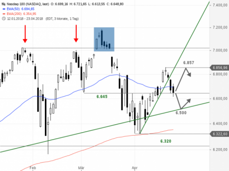 Ein Schlusskurs unter 6.645 Punkten dürfte dagegen weitere Verkäufer auf den Plan rufen. In diesem Fall wäre ein Test der Trendlinie bei rund 6.500 Punkten fast schon als Mindestziel anzusetzen. Auch ein direktes Durchrutschen an den EMA200 bei 6.355 Punkten sollte man nach einem solchen Signal auf dem Schirm haben.