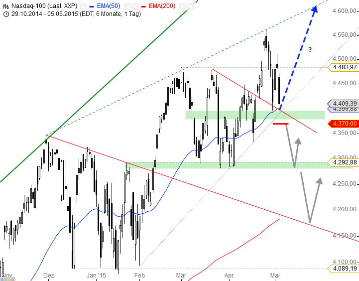 Um Verkaufssignale im Mai abzuwenden müsste sich der Index in den kommenden Tagen dringend wieder nach oben orientieren. Für ein Kaufsignal gilt es die 4.520 zu überwinden, dann ist Platz bis zur Pullbacklinie bei ca. 4.600 Punkten. Wird die Kreuzunterstützung bei 4.380 – 4.400 Punkten hingegen aufgegeben, könnte ein Rückfall unter 4.370 weitere Verkäufe nach sich ziehen und Abgaben bis 4.280 – 4.293 oder 4.180 Punkte einleiten.