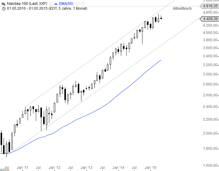 Nasdaq-100® in Punkten im Monatschart: 1 Kerze = 1 Monat (log. Kerzenchartdarstellung)