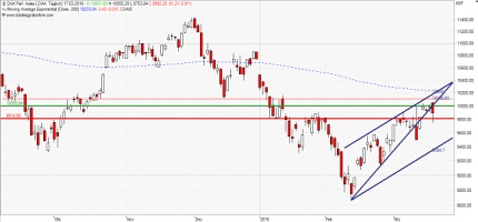 Schlusskurslinie, leicht unterhalb der Unterstützung bei 9.814 Punkten oder aber nach der ersten Korrektur einer Abwärtsbewegung