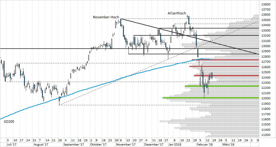 Mit Kursen im Bereich von 12.500 Punkten war der DAX stark in die neue Handelswoche gestartet, konnte die Auftaktgewinne jedoch ohne die fehlende Unterstützung der Wall Street (diese blieb feiertagsbedingt geschlossen) nicht lange halten. Die Kurse drehten daher direkt nach dem Handelsbeginn wieder nach unten ab und rutschten zur Schlussglocke bis auf 12.386 Zähler zurück (-0,5%) ...