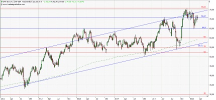 SAP befindet sich seit rund sechs Jahren in einem übergeordneten Aufwärtstrend. Dabei erreichte die Aktie im März 2013 mit 65,00 Euro fast das
