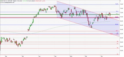 Eröffnet SAP leicht im Plus, käme aus Sicht der Charttechnik ein Kauf bei einem Rücksetzer auf den gestrigen Schlusskurs bei 70,58 Euro,