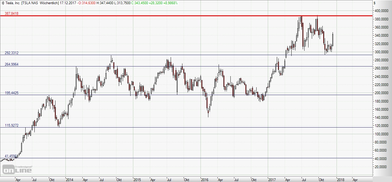 Seit der Börseneinführung im Juli 2010 führte der Elektroauto-Hersteller Tesla Motors bis zum März 2013 ein Mauerblümchendasein an der Nasdaq und bewegte sich in diesem Zeitraum mehr oder weniger unbemerkt zwischen 20,00 und 42,00 USD hin und her. Im April 2013 ging es dann innerhalb von fünf Monaten rasant bis auf 195,44 USD nach oben, bevor größere Gewinnmitnahmen einsetzten, die mit einem Tief bei 115,92 USD Anfang Dezember 2013 endeten. Mit einer Umkehrkerze endete abrupt der Abwärtstrend und führte die Aktie in zwei größeren Schüben bis zum September 2014 auf ein neues historisches Hoch bei 292,33 USD, bevor eine Korrektur bis auf 181,17 USD einsetzte. Ein erneuter Versuch im Juli 2015, ein weiteres Allzeithoch zu generieren, scheiterte. Bis Ende 2016 bewegte sich die Aktie in einem Abwärtstrend, der Anfang Januar 2017 umgekehrt wurde. Tesla Motors ist seitdem auf ein neues Hoch bei 389,10 USD gestiegen, um von dort aus nach einem Doppeltop im Oktober 2017 25 Prozent zu korrigieren. Seit einer Woche steigt Tesla nach dem Bruch des Abwärtstrends deutlich an. Die Reversal-Kerze am Freitag lässt mehr nach oben erwarten. Die Long-Szenarien: Startet Tesla Motors leicht im Plus, käme eine Platzierung bei einem Rücklauf auf den Freitagsschlusskurs bei 343,45 USD, leicht oberhalb des Widerstands bei 349,37 USD oder aber in der ersten Korrektur einer Aufwärtsbewegung in Frage, und zwar rund 40 Prozent unterhalb des letzten Hochs. Wird jedoch im Minus eröffnet, sollte ein Kauf bei einem Abprall an der Unterstützung bei 338,30 USD, durch die eben besprochene Korrekturvariante oder nach dem Bruch des Schlusskursniveaus erfolgen. Aus Sicht der Charttechnik spricht nichts gegen eine Gewinnmitnahme circa 2,50 USD oberhalb des jeweiligen Tagestiefs. Die Short-Szenarien: Beginnt die Aktie leicht im Minus, bietet sich eine Positionierung bei einem Test der Schlusskurslinie, leicht unterhalb des 338,30-USD-Niveaus oder aber nach der ersten Korrektur einer Abwärtsbewegung an, und zwar nach dem Bruch des letzten Tiefs. Wird aber im Plus gestartet, könnten Trader durch die gerade beschriebene Korrekturvariante, bei einem Abprall vom 349,37-USD-Widerstand oder leicht unterhalb der Schlusskursmarke einsteigen. Der Zielbereich aus Sicht der Charttechnik läge circa 7,25 USD unterhalb des jeweiligen Tageshochs. Sinnvoll wäre eine Absicherung aller Trades durch einen Stopp in Höhe von circa 2,20 USD, bei Long-Trades unter- und bei Short-Trades oberhalb des Einstiegs. |