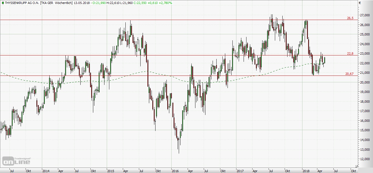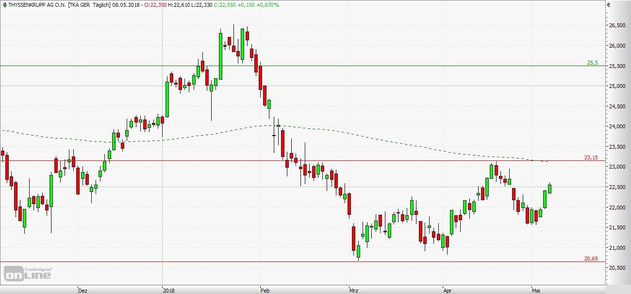 ThyssenKrupp erreichte das bisherige Tief in dem seit 2008 anhaltenden Baisse-Zyklus im Juni 2012 bei 11,45 Euro. Von Mitte 2012 bis Mai 2015 ging es unter teilweise heftigen Schwankungen nach oben. Im Verlauf dieser Aufwärtsbewegung erreichte ThyssenKrupp Mitte Mai 2015 bei 26,43 Euro ein Zwischenhoch. Von diesem Kursniveau erfolgte ein Absturz, der Mitte Februar 2016 im Bereich von 12,50 Euro gestoppt wurde. Die anschließende Erholung endete im Februar 2017 bei einem Zwischenhoch von 24,69 Euro. Nach einer Korrektur startete die Aktie wieder durch und erreichte im Juli 2017 den höchsten Stand seit Mitte 2011. Es folgte eine volatile Seitwärtsphase, bevor der Titel Im Herbst des vergangenen Jahres erneut abtauchte und in den Bereich von 21,50 Euro zurückfiel. Von dort startete Anfang Dezember eine erneute Aufwärtsbewegung, die den Kurs von ThyssenKrupp Ende Januar bis in den Bereich von 26,50 Euro hievte. Danach ging die Aktie in den freien Fall über und fand erst unterhalb der 21,00-Euro-Marke einen vorläufigen Boden. Die anschließende Erholung endete Mitte April knapp über der 23,00-Euro-Marke. Nach einem kurzen Rücksetzer befindet sich die Aktie seit der vergangenen Woche wieder auf Erholungskurs. Kurzfristig eröffnet sich damit weiteres Aufwärtspotenzial. Kommen wir nun zu den Einstiegsszenarien für kurzfristig interessierte Trader. Die Long-Szenarien: Eröffnet ThyssenKrupp leicht im Plus, käme aus Sicht der Charttechnik ein Kauf bei einem Rücksetzer auf den gestrigen Schlusskurs bei 22,55 Euro, dem Bruch der 23,00-Euro-Marke oder aber in der ersten Korrektur einer Aufwärtsbewegung in Frage, und zwar rund 40 Prozent unterhalb des letzten Hochs. Wird aber im Minus gestartet, könnten Trader nach den Regeln der technischen Analyse durch die eben geschilderte Korrekturvariante, bei einem Abprall an der Unterstützung bei 22,00 Euro oder aber nach dem Bruch der Schlusskursmarke einsteigen. Das Kursziel wäre circa 0,70 Euro oberhalb des jeweiligen Tagestiefs zu suchen. Die Short-Szenarien: Beginnt die Aktie leicht im Minus, indiziert die Charttechnik eine Positionierung nach einem Abprall vom Schlusskursniveau, leicht unterhalb der 22,00-Euro-Unterstützung oder aber nach der ersten Korrektur einer Abwärtsbewegung, und zwar nach dem Bruch des letzten Tiefs. Wird jedoch im Plus eröffnet, bietet sich eine Platzierung bei einem Abprall von der 23,00-Euro-Marke, durch die eben beschriebene Korrekturvariante oder nach dem Bruch der Schlusskurslinie an. Rund 0,70 Euro unterhalb des jeweiligen Tageshochs könnten Gewinne mitgenommen werden. Eine Absicherung aller Trades sollte durch einen Stopp in Höhe von mindestens 0,25 Euro erfolgen, bei Long-Trades unter- und bei Short-Trades oberhalb des Einstiegs.