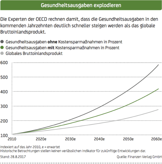 Laut Deloitte werden die Gesundheitsausgaben bis 2020 weltweit um 4,0 Prozent p. a. auf 8,7 Billionen Dollar steigen. Übernahmen wie zuletzt Actelion durch J&J stehen in der Pharma- und Biotechbranche sozusagen auf der Tagesordnung. Mit sorgfältig ausgewählten Produkten lässt sich bei bedingtem Teilschutz in den Healthcare-Sektor investieren.