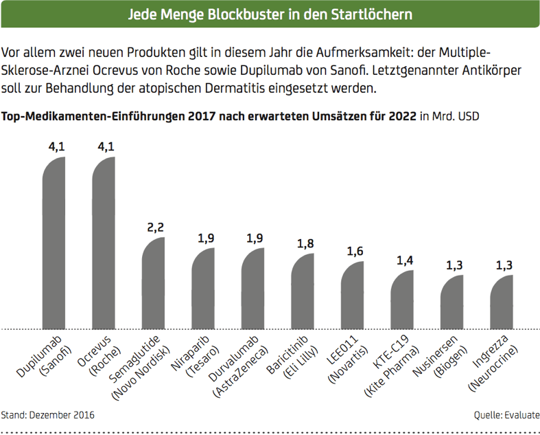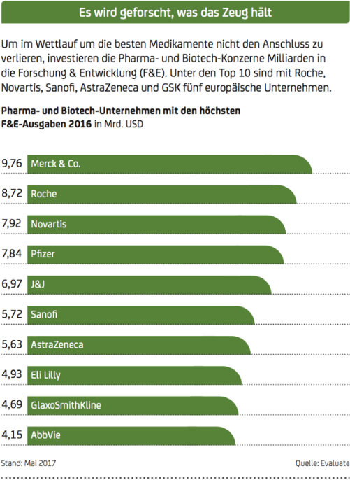 Der Kuchen wird aber nicht nur unter den Big Playern aus Übersee wie Pfizer, Merck & Co. und Johnson & Johnson (J&J) aufgeteilt. Die Europäer sind mittlerweile auf Augenhöhe mit den US-Konzernen. Firmen wie Roche, Novartis oder auch Sanofi verfügen über ebenso unverzichtbare Pillen. Erstgenannte ist der größte Krebsmittelhersteller weltweit. Damit das auch so bleibt, investiert Roche massiv in Forschung & Entwicklung (F&E). Aus diesen Laboren stammen wichtige Medikamente wie Rituxan, Avastin und Herceptin, die allesamt auf mehr als sechs Milliarden Dollar Umsatz pro Jahr kommen. Ein neuer Blockbuster steht in den Startlöchern: Ocrevus. Die Arznei gegen Multiple Sklerose generierte seit der offiziellen Vorstellung im April 2017 165 Millionen Dollar. 2022 werden dem Medikament bereits 4,1 Milliarden Dollar zugetraut.
